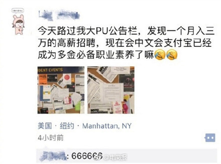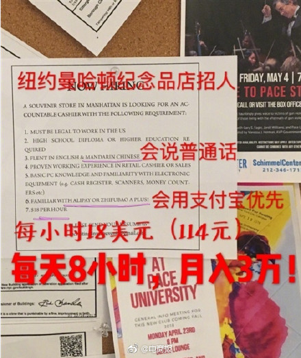 美国纽约的学校公告栏上出现了一则高薪招聘启事:某纪念品店招聘会讲普通话会用支付宝的中国员工,时薪18美金(约114人民币)。