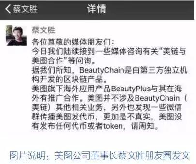 在白皮书中有介绍说美链与美图公司是战略合伙关系,并没有明确说明BEC是美图发行的代币。而美图也不止一次辟谣:没有发布任何代币或token,BeautyChain是独立第三方机构开发的产品,只是跟美图海外版BeautyPlus有推广合作。