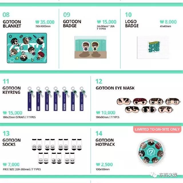 在音乐活动之外,很多韩国公司都会开发衍生品,并且这些衍生品与偶像组合高度挂钩,被称为“周边”。基本上每个组合举办演唱会与fan meeting的时候都会贩卖官方周边,如下图是JYP旗下组合GOT7成立四周年fan meeting所贩卖的官方周边,从种类来看从普通的写真、照片到衣服、帽子均涵盖在内。