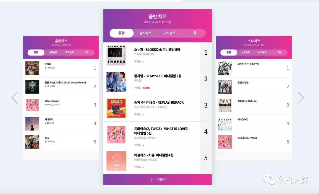 在实体专辑上,Hanteo是一个比较权威的榜单,它记录了每天线上线下的专辑销量,将每个偶像组合的销量直观地呈现出来。多方位的排名机制下,催生了“打歌节目”,这是一个向偶像组合提供展示其歌曲舞台的平台,韩国的主流电视台都设置了这一栏目,通过舞台的展现及各项流媒体数据的监测,以打分制排列出当周的一位,而这个一位就成为了一个组合成绩的证明。