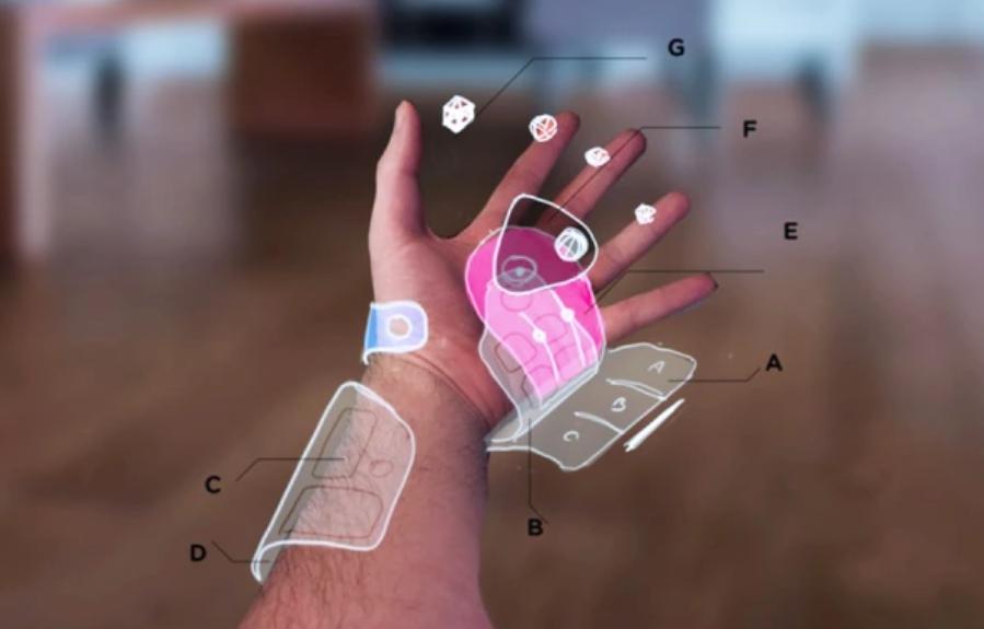 另外一个虚拟的设备就是virtual wearables,它也是一种“权力之手”相辅相成的一个与虚拟世界交互的重要工具。它在你的手或手腕周围添加一个虚拟设备,看起来像一个真实的显示。就想象着在这个虚拟世界中有一个智能手表,并且这个手表可以根据周围的环境进行一定的调整。虚拟可穿戴设备不需要通过记住无数的手势来调用不同的菜单或按钮,它们看起来和行为就像咱们在真实世界中熟悉的界面一样可以进行例如点击、打开、扭曲、转向或滑动等操作。