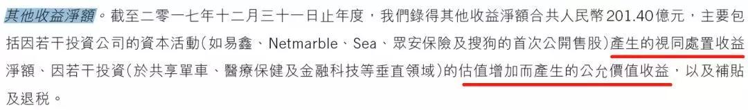 目前的腾讯,通过投资已深深的掌握人们的生活,衣食住行玩你绕得开“新美大、链家、滴滴、快手等投资的600家公司”?腾讯2017年报显示,其他收益净额201亿(IPO或融资使公允价值提升),包括: