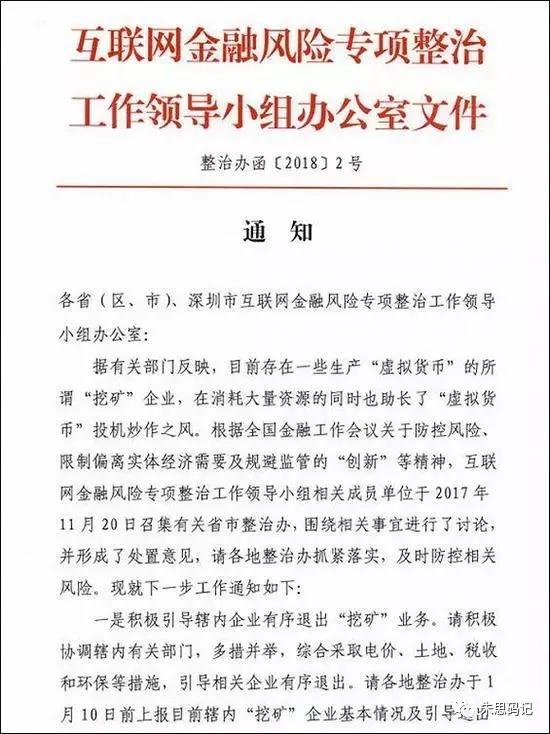 2018年1月2日,中国人民银行互联网金融风险专项整治工作领导小组办公室发布相关挖矿企业的整治文件,直接引发矿圈大规模恐慌。