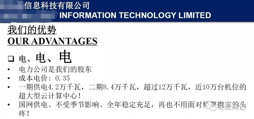 朱思码记为读者做了这样一道算术题:按照当前比特大陆最新型号——蚂蚁S9 14T 矿机(1350W+机器自损耗10%),线路电力损耗5%,140000KW的装机量约为9万台,对比装机规模4万台,投资12亿元人民币的内蒙古创客云计算大数据产业园矿场,粗略估算出其投资规模至少在27亿人民币以上。