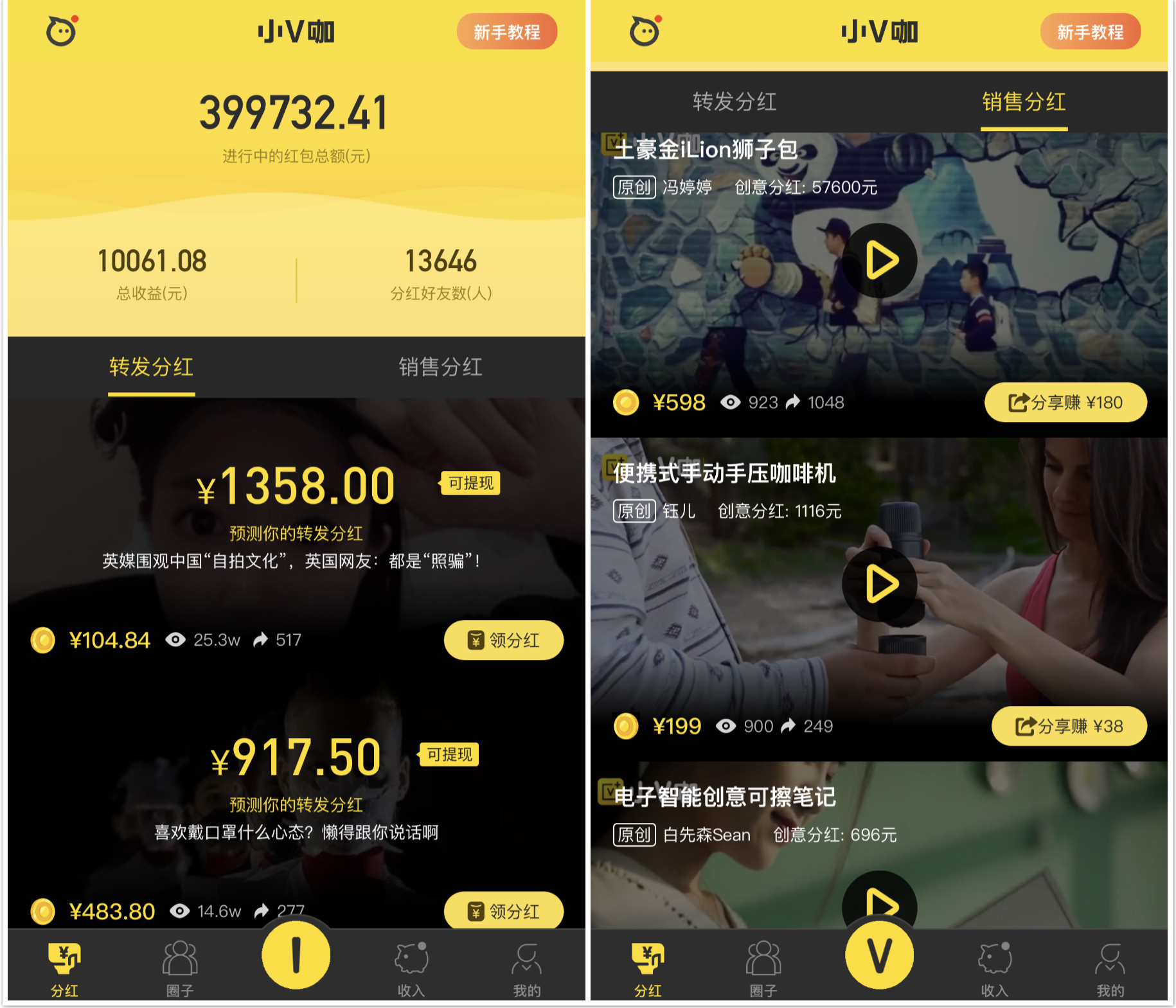 对于用户而言,小V咖的吸引力在于高额收益。为培养用户的分享习惯,小V咖对用户所得佣金暂不扣费;若好友通过分享链接成为分享者,则分享人可获得好友每笔收入的5%-20% 。另外,对于一些会生产内容但没有代理产品的人,小V咖联合京东为其对接品牌主。品牌方提供200元以内的产品(SKU在1000多个),创作者则负责生产10s短视频,但凡有人通过视频链接下单,品牌主将给创作者分红。