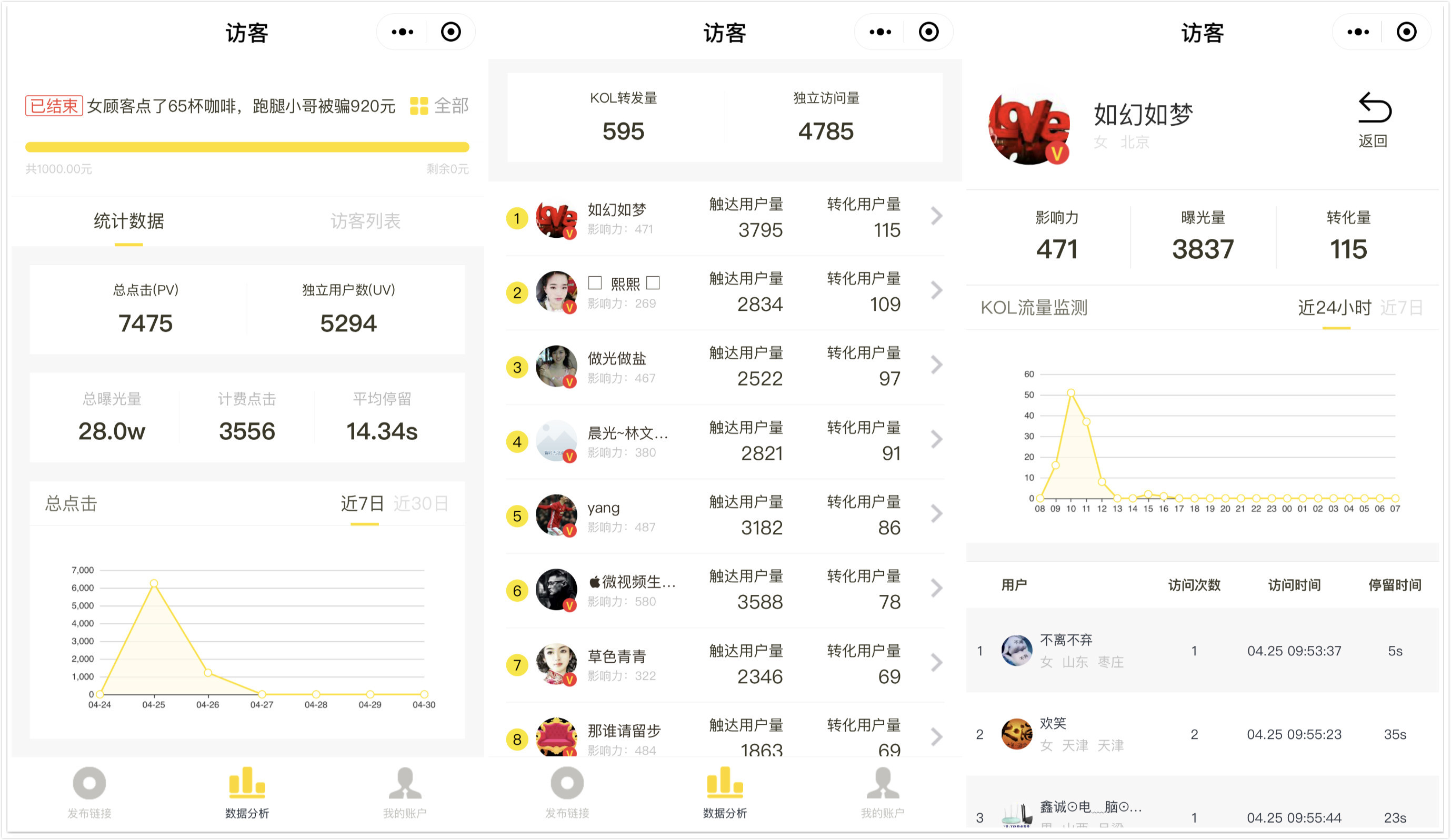 在上图的用户界面中,平台给出了任务内容、该任务有效点击的单次收益(销售提成)、剩余奖金、浏览人数、转发人数等信息。