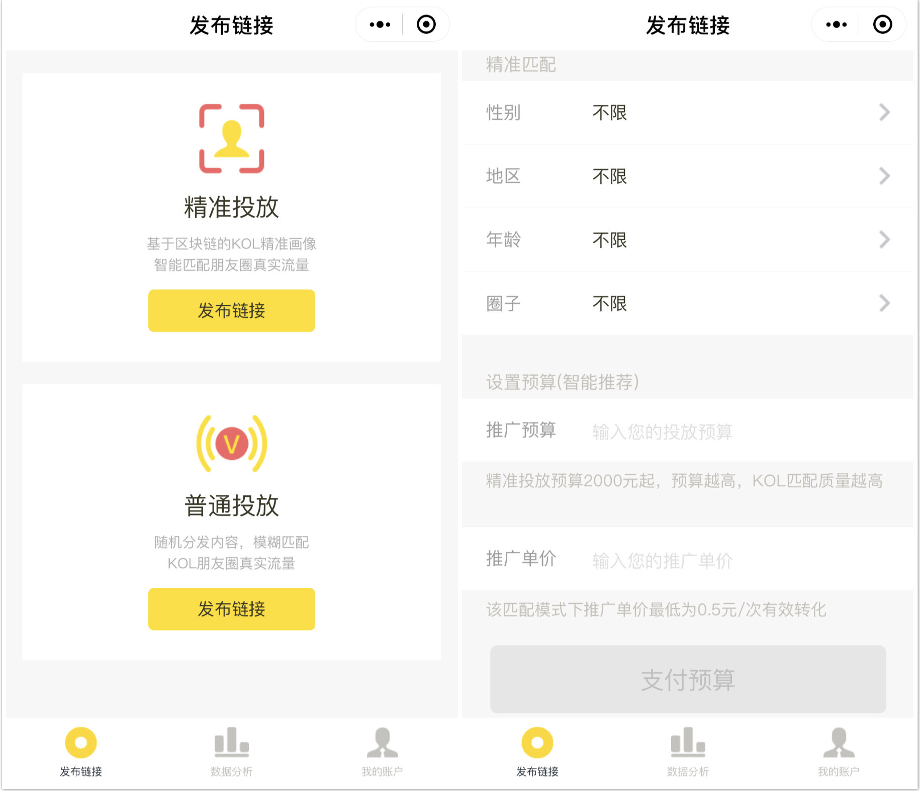 画像精准。据小V咖创始人兼CEO张宏达介绍,小V咖采集了分享者多个维度的数据,来作为其影响力(可挖矿)的依据,包含三个方面,一是用户的属性数据,包括年龄、性别、地域、订阅的圈子等。第二是用户的动态数据,包括其浏览并转发至微信的内容/商品,与好友的交互等。第三即是用户在分享时有效的曝光量,点击量及拉新的能力。通过对这些数据的深度学习,小V咖的智能算法可预测分享者的分享价值和转化效果,从而对每个人的CPC智能出价(即同一个任务每个人看到的单价是不一样的),以此来提升商家奖励金的使用效率。
