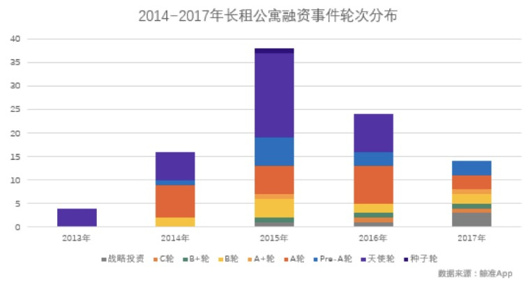 鲸准数据显示,2014年资本开始进入长租公寓,2015年长租公寓领域融资出现爆发式的增长,总投资近40起;2016年和2017年赛道融资趋冷,早期融资减少,投资进入缓冲期。