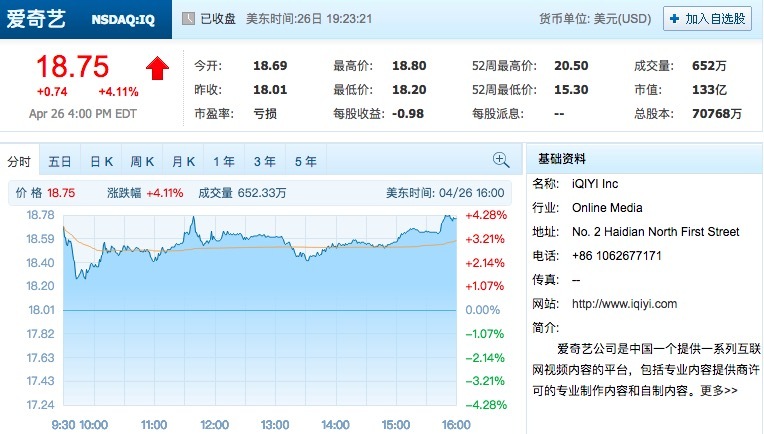 截至美东时间4月26日收盘,爱奇艺股价为18.75美元,增幅达4.11%,略高于18美元的发行价。目前,公司市值133亿美元。