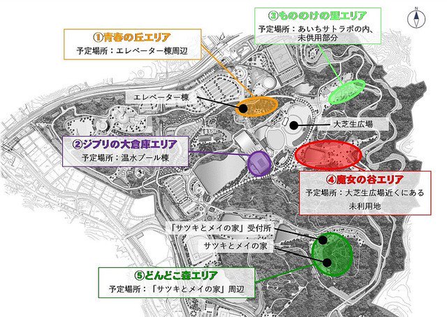 吉卜力主题公园主要分为 5 个主题园区,分别是「青春之丘」、「幽灵故里」、「魔女之谷」、「咚咚吭森林」和「吉卜力大仓库」,将坐落在「世博会纪念公园」200 公顷的绿地上。