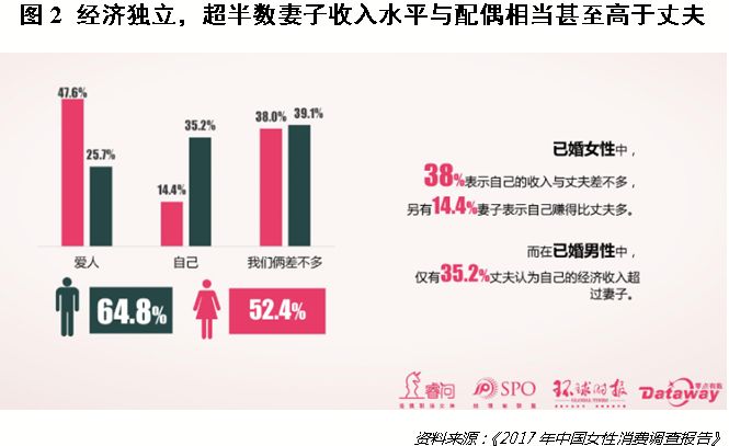 根据国家统计局公布的《中国妇女发展纲要(2011-2020年)》,2016年中国女性就业人员占全社会就业人员的比重为43.1%,超过纲要规定40%的目标。而《2017年中国女性消费调查报告》显示,52.4%的女性认为收入水平与配偶相当/相近(参见图2);财务独立和收入增长使得女性消费需求逐步释放,近半数女性个人消费占家庭收入的1/3以上。