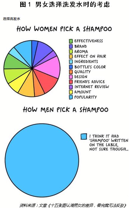 追本溯源,之所以会有“她经济”的问世,很大程度上取决于男女性思维方式的不同。前一阵子,网上流行的一张趣味图片——“男女选择洗发水时的考虑”(参见图1),十分形象的揭示了男女思维的差异。