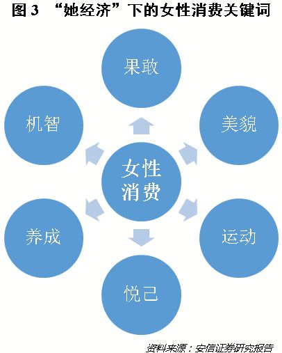 根据安信证券的研究报告,价值追求与品质追求逐渐成为新时代女性消费的主旋律,在边界与日扩张的“她经济”生态圈中,“果敢、美貌、运动、悦己、养成、机智”已然成为女性消费的关键词(参见图3)。如此,商家梦寐以求的商机,或许会在以下四个方面有所体现: