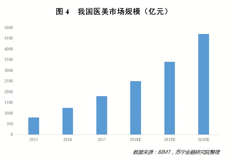 爱美是女人的天性。女性群体的崛起让“颜值经济”呈井喷式发展,医疗美容也已经逐渐由极少数人群的专属向广大群众普及。BIMT的统计数据显示,我国医疗美容市场将于2020年达到4640亿,年均复合增长率达38.14%(参见图4)。而ISAPS(国际美容整形外科学会)的数据同样证实,我国已经成为仅次于美国和巴西的全球第三大医疗美容国家。