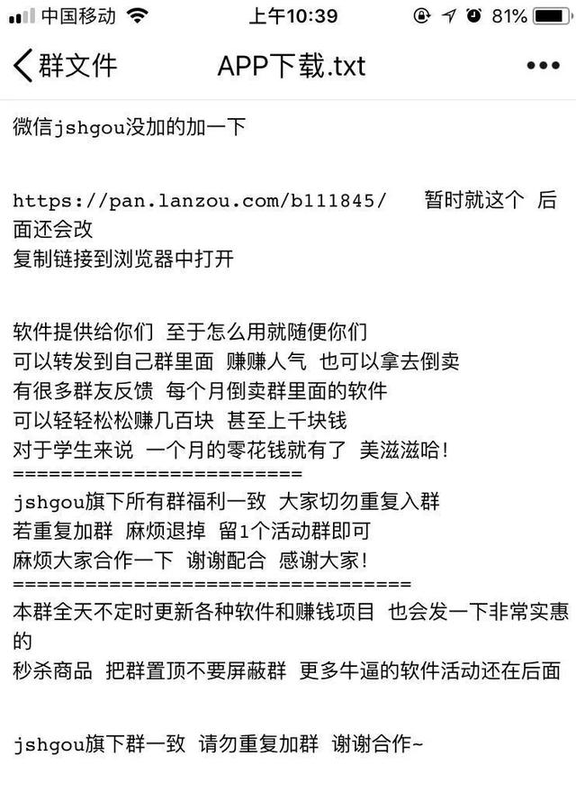 他分享的内容几乎都是“聚实惠购”网站上的淘宝优惠券信息。偶尔会发一些“福利内容”。福利内容与群公告调性相同:所有QQ群用户都可以免费下载群文件中的软件,通过在手游、新浪微博等大流量平台贩卖,赚取零花钱。