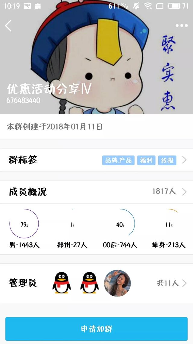 可以看到,1817名群员中,00后占到了40%。群介绍称这个QQ群人员已满,将用户引流到了另一个QQ群“优惠活动分享九”,小娱通过这个QQ群的审核后,发现群里全员禁言,只有群主可以发言。