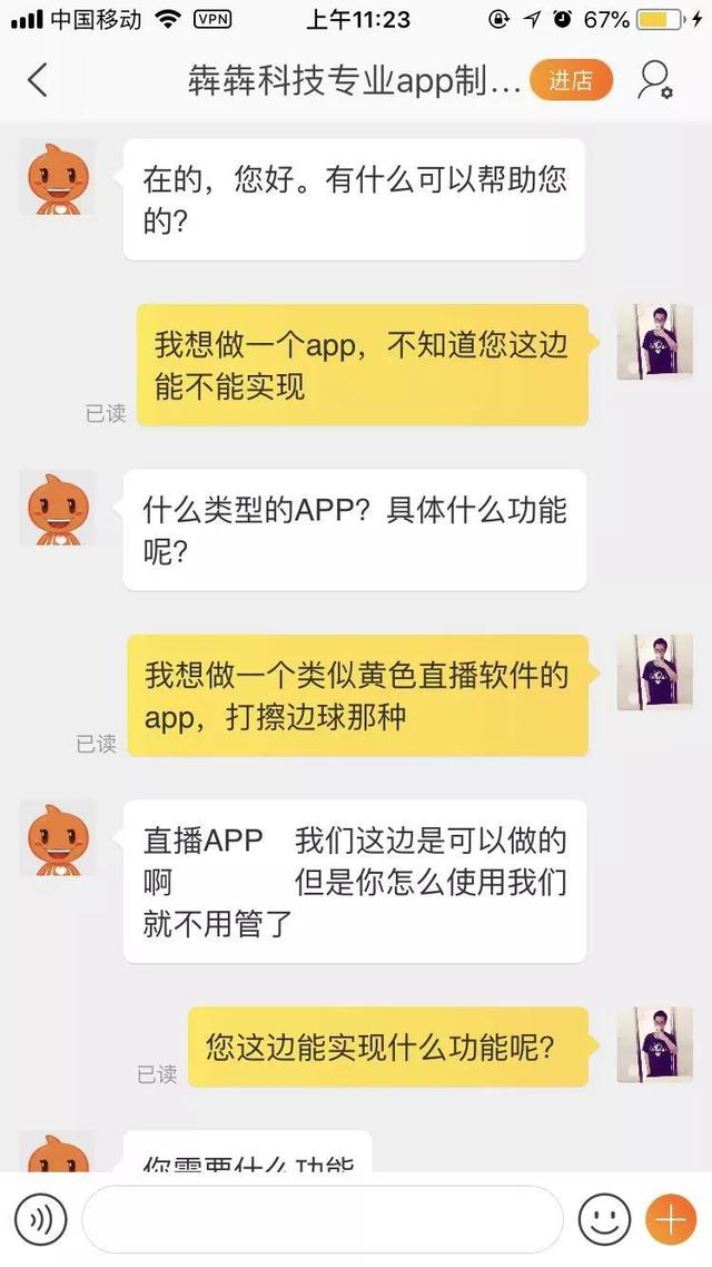 即便不懂技术,在淘宝购买完整的定制软件服务也仅仅需要不到2万元。小娱在一家淘宝店中询问客服,能否制作一款色情直播软件,客服似乎已司空见惯,表示“你用来干什么我不管,反正我能给你做出来。”