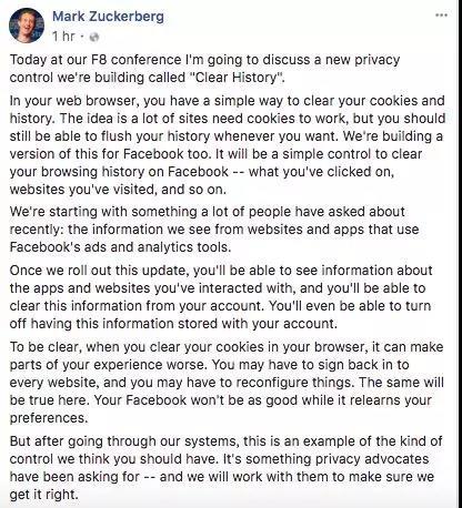 他在大会前一小时,Po了上面这么一段话,提到 Facebook 构建了新的用户隐私控制方式,比如用户可以看到哪些应用是用着你的个人信息的,你可以选择一键清除你的cookies等等。