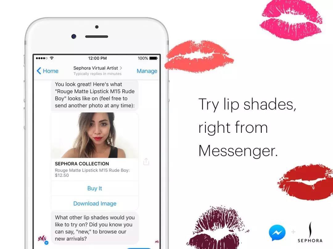 举个例子,全球彩妆连锁巨头丝芙兰在和你通过 Facebook Messenger 聊天的话,你可以通过 AR 直接 “试” 不同颜色的眼影、腮红等,不出家门就能看到不同化妆品在自己脸上的效果了,美不美?