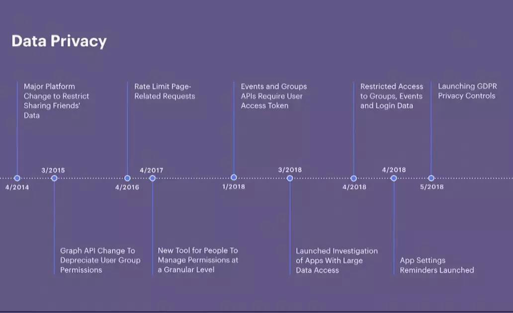 F8 大会上也给了个路径图,从今年3月开始启动对拥有大规模用户数据第三方APP的调查之外,还给用户发送提醒,你到底登录了哪些第三方APP,不想用的可以删除。在这个月,Facebook 还准备针对欧盟数据法案,发布相应的隐私控制细节了。