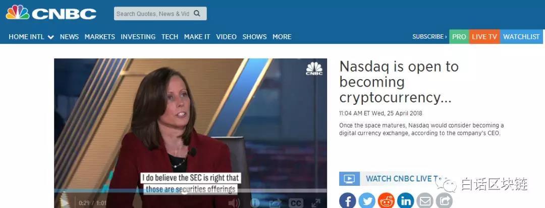 我们追踪到这则新闻出处来自CNBC的官网,CNBC是美国NBC环球集团旗下的有线电视卫星新闻台,是全球财经媒体中的权威媒体。我们通过其官网的检索搜索到了原视频。纳斯达克CEO Adena Friedman 在视频中的原话为“Certainly Nasdaq would consider becoming a crypto exchange over time”;翻译成中文大意是:当然随着时间推移纳斯达克会考虑提供加密货币的交易。