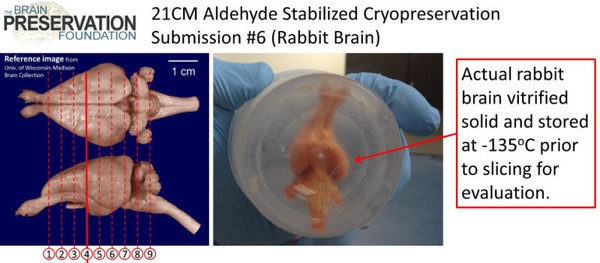 2016年,来自 21 世纪医学(21 CM)的研究团队成功的在实验中利用新冷冻技术,让兔脑能以“接近完美”的状态保存。研究团队利用了一种叫做“稳定乙醛”的全新冷冻保存技术,在兔脑中的血管系统注入化学物质,此方式能让兔脑中的整体温度降到摄氏 -135 度。