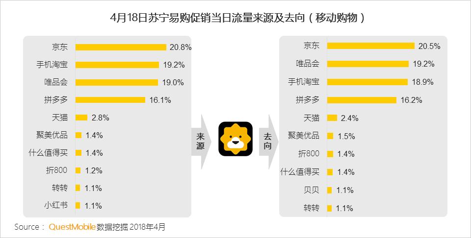 QuestMobile数据显示,由于苏宁本次促销以3C类产品为主要卖点,这也是京东的强势领域。因此在用户来源与去向中,京东占比重都最大。用户徘徊比价特征明显。
