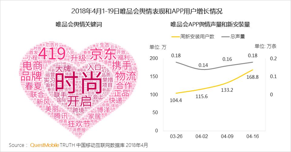 QuestMobile数据显示,唯品会在4月1-19日的舆情多与促销相关,其次是与京东合作相关。在促销活动开启前,APP新安装量增加明显。