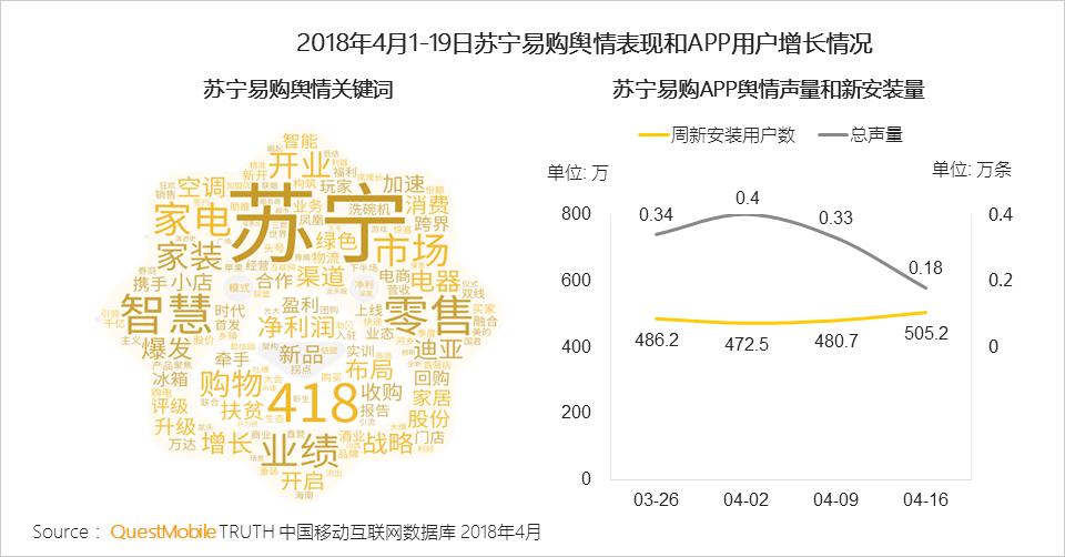 QuestMobile数据显示,4月初苏宁易购对此次促销活动进行了大量宣传。并且由于苏宁易购在3月底发布2017年年报,提出智慧零售概念,相关舆论声量上升明显。APP新安装量也大幅增加。