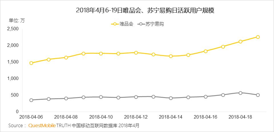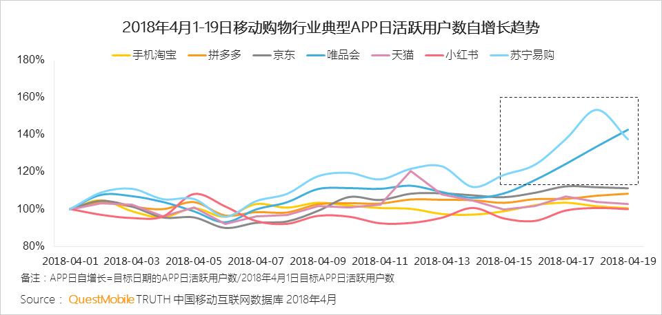 其中,苏宁易购在4月18日DAU比前5日平均DAU增长25%,唯品会在4月19日比前5日平均DAU增长了21%。