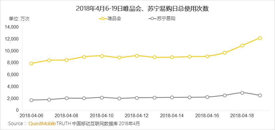 其中,苏宁易购在促销前一周(4.6-4.12日)日使用次数在2000万次左右,而在促销当日接近3000万次。 唯品会在4月18日使用次数便突破1亿次,在4月19日更是突破1.2亿次。