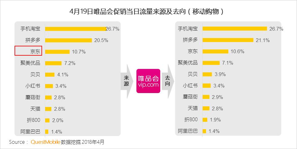 京东2018年3月在首页加入了唯品会入口,对唯品会的导流效果明显。 QuestMobile数据显示,在唯品会的移动购物流量来源APP中,京东高居第3。