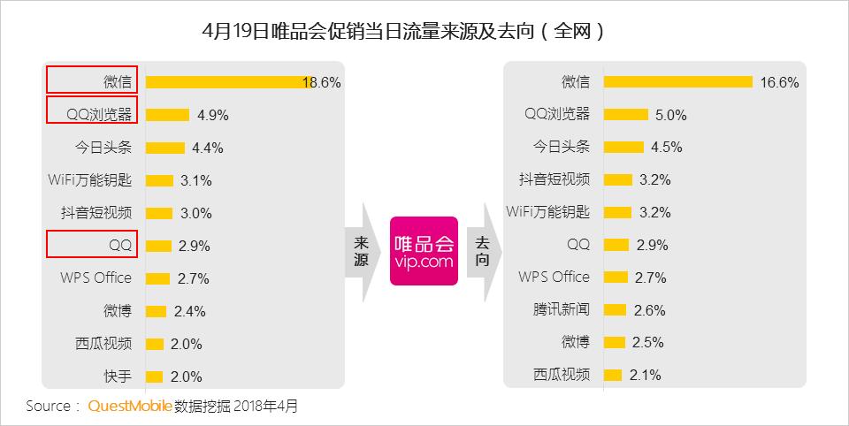 QuestMobile数据显示,从全网来看,唯品会流量来源前十APP中,有3个是腾讯旗下的产品。唯品会在接受腾讯投资后,在流量方面获得了腾讯的扶持,受益明显。