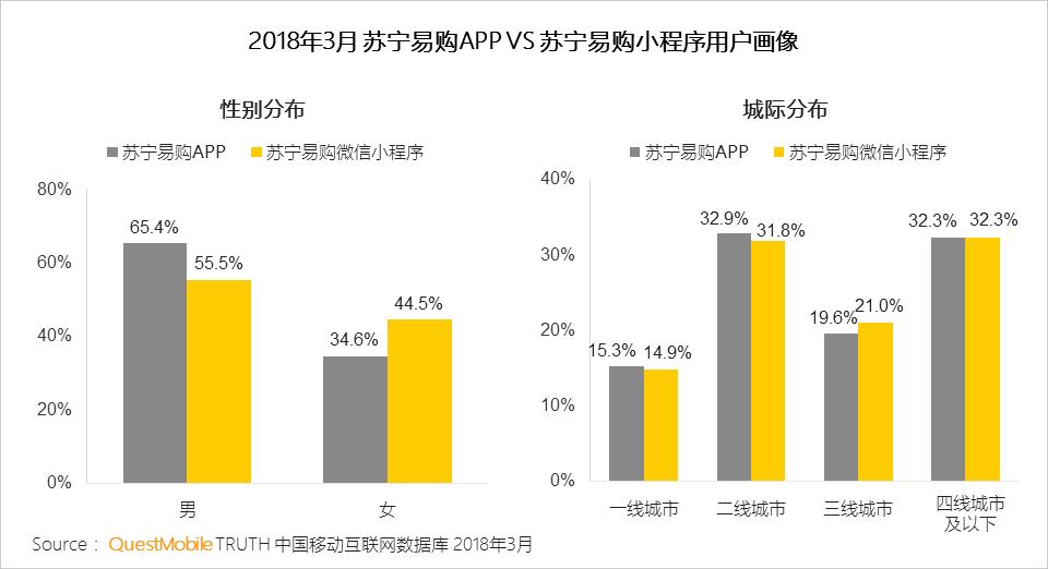 四、苏宁易购微信小程序吸引了更多女性、年轻用户,唯品会微信小程序则覆盖到更多三四线城市及以下用户