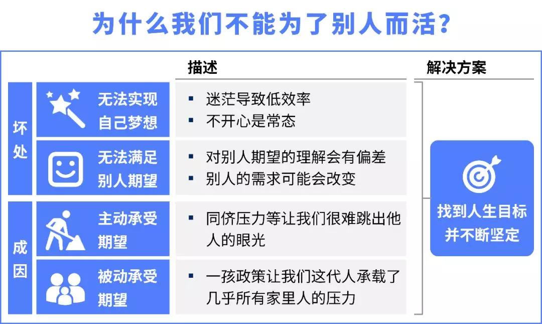 之所以通过「别人的期望」来作为自我估值的主要手段,通常是因为你还没有找到自己的人生目标,或是对自己的心之所向仍不够坚定。所以你才会用世俗的标准化路径来要求自己。
