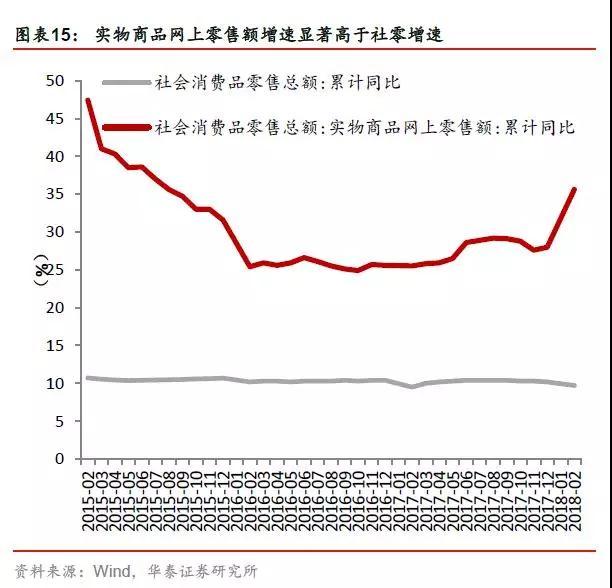 所谓的“消费降级”也属于消费升级的一种,即消费观念的升级,消费者日趋追求理性消费,体现更加成熟的消费观。“双十一”、“618”等网络促销购物节销售额逐年攀升正是最直观的体现。2017年“双十一”,天猫、淘宝总成交额1682亿元,同比增长39.35%,较2016年提高逾7个百分点,一方面体现出我国居民具备消费能力,经济内生需求仍有很大的挖掘空间;另一方面,更是体现出了理性消费观念的转变。具体到商品类别,网络购物节销售排名前几的商品类目分别是:手机、家电、家具、家纺等,对应到社零数据中,分别是文化及办公用品、通讯器材、家用电器、家具、纺织服装等类别。
