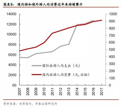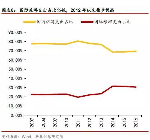 其次,旅游消费。近年来我国旅游业稳步发展,境内和出境旅游人次持续正增长。据国家旅游总局,2017年旅游业对GDP的综合贡献为9.13万亿元,占GDP总量的11.04%。2012年以来,国内旅游支出增速持续保持15%左右的稳定较高水平,高于同期社会消费品零售总额增速。虽然国际旅游支出占比低于国内旅游支出,2016年两者比重分别为30.6%和69.4%,但2011年以来国际旅游支出比重处于波动上行的状态。从人均消费来看,境内游和境外游人均消费近年来持续攀升,2016年,境外游人均消费约12831元人民币,境内旅游人均消费约888元。