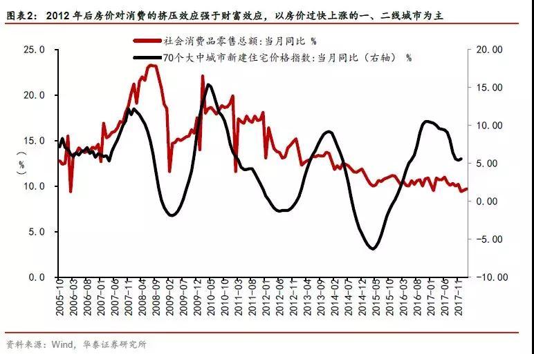 我们认为,局部“消费降级”来源之一是高房价对部分群体消费者其他消费的挤出效应,这部分消费者主要集中于一二线城市。一二线城市与三四线城市房价对消费的影响不同,房价对消费既有挤出效应又有财富效应,一二线挤出效应强于财富效应,三四线财富效应强于挤出效应。