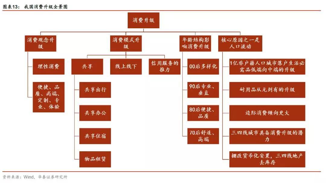 市场对消费升级的理解相对比较片面,市场一般观点认为消费升级主要体现为消费者由中端产品向高端产品,高端产品向个性化、定制化产品的升级,其实这只是消费升级的一个部分,消费升级至少可以有以下几个维度的体现:1)消费观念的升级:理性消费,“消费降级”体现消费者更加成熟的消费观;便捷、品质、高端、定制、专业和体验;2)消费模式的升级:共享;线上线下;消费金融的推动;3)生活必需品同样存在消费升级;4)不同年龄阶段的消费升级大不同;5)不同收入水平居民的消费升级有显著差异,我们认为我国目前消费升级的核心原因之一将来自于人口流动。