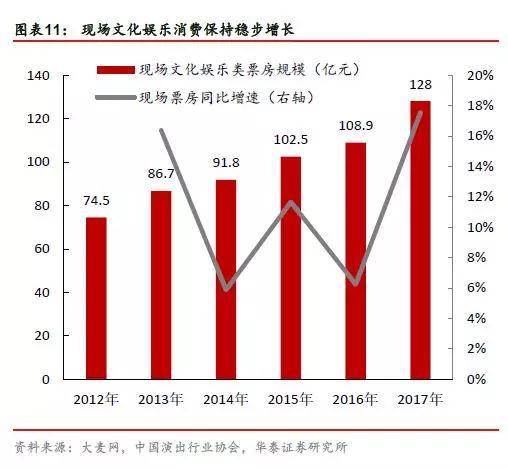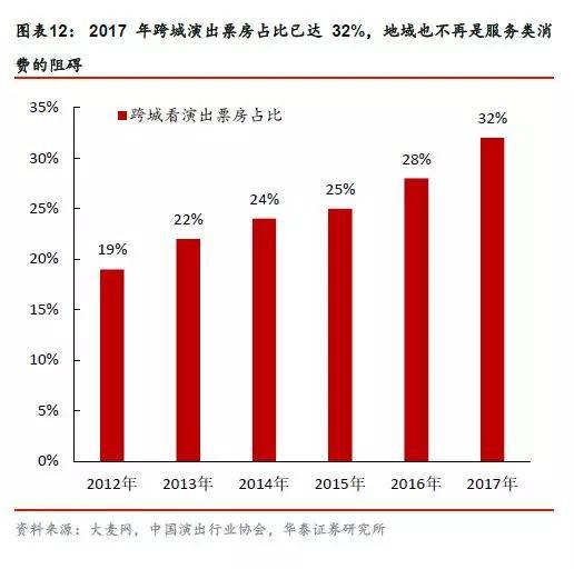 根据大麦网、中国演出行业协会的数据,现场娱乐(指可在现场观赏或体验的娱乐活动)类型的服务类消费也在保持逐年增长趋势,过去五年(2013-2017年)复合增长率达11.4%,2017年票房规模已达到128亿元。同时,从2012年至2017年,用户跨城观演的票房贡献占比从19%连年增至32%,地域不再成为服务类娱乐消费的阻碍,尤其是二线发达城市苏州、宁波、佛山等受一线城市的辐射,跨城观演占比已超六成,可见更注重现场感营造的服务类娱乐支出满足了消费者日益升级的体验需求,正在成为精神文化消费的主要组成部分。