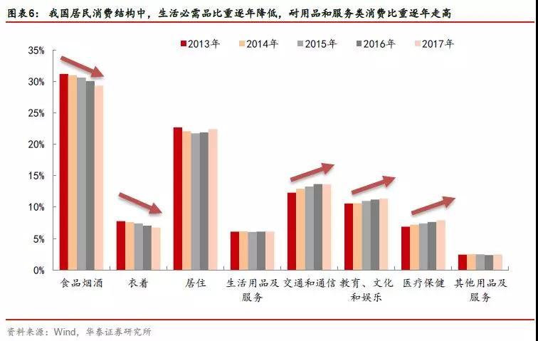 为了避免微观数据的干扰,我们需要观察更具代表性的宏观和中观数据。从宏观的角度来看,我国居民的消费结构近几年出现了明显的变化,食品烟酒、衣着等生活必需品消费的比重逐年走低,交通通信、家具、家电、教育文娱、医疗保健等耐用品和服务类消费比重不断攀升。部分群体的“消费降级”主要原因在于,随着居住、汽车、教育、文化娱乐等方面支出的增多,在总收入一定的情况下,对生活必需品消费的压缩,体现出的是消费结构的调整。