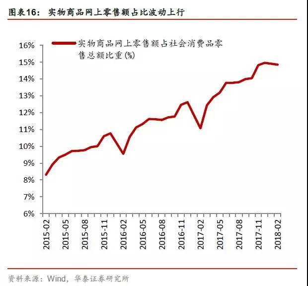 消费模式的升级主要体现为线上线下融合、共享及消费金融的推力几个方面。首先,最典型的消费模式变化就是近年来网上零售额增速和占比的持续走高。2017年,我国网上商品零售额同比增长28%,持续高于全社会消费品零售总额增速,占比也逐年走高至15%,网上消费对整体消费的影响越来越大,尤其是6月、11月旺季体现的更加明显。