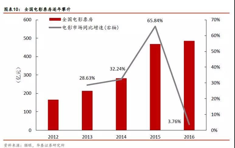 再次,文化娱乐消费。文娱消费比重增加是消费升级的重要体现,根据猫眼大数据,2012年至2014年全国电影票房维持在30%左右的增速稳步上涨,2015年更是同比增速达到65.84%,2016年涨势遇冷后,国家新闻出版广电总局数据显示,2017年票房仍突破550亿元大关。