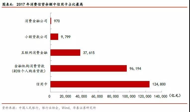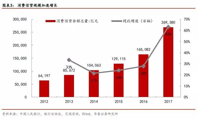 我国的消费金融市场目前处于快速发展阶段,据我们测算,截至2017年底,我国消费信贷余额达26.9万亿。近5年消费信贷规模一直保持在20%以上的增速,2017年呈飞跃式增长,同比增速达63.2%,消费金融的快速发展成为近年来我国消费高景气度的重要因素。结构数据显示,信用卡贷款余额为12.48万亿,约占总消费贷款46.3%,占主导地位。另外,汽车金融规模虽目前体量仍然较小,但近几年均保持20%的较高增速,2018年1月1日起修订版《汽车贷款管理办法》正式实施,新版《办法》汽车类型增加新能源汽车,且新能源汽车贷款比例(自用型85%)高于传统动力汽车(自用型80%),将二手车贷款最高发放比例由50%调整为70%,众多利好催化下,我们预计《汽车贷款管理办法》实施后,汽车信贷增速有望进一步提高。