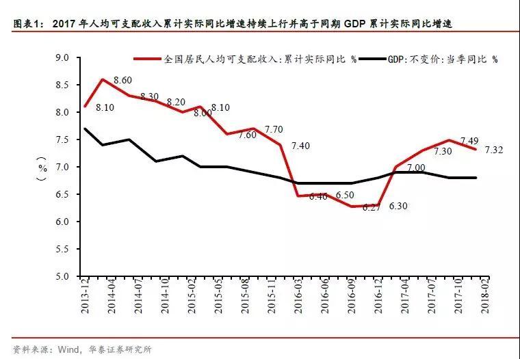 从总量的角度来看,对居民消费影响有显著影响的收入因素可以分两个角度来看,流量收入和存量收入。一般使用居民人均可支配收入来度量流量收入,2017年,我国居民人均可支配收入实际同比增长一直维持在7%以上高位,始终高于同期GDP实际增速,全年人均可支配收入累计同比增长7.32%,GDP累计同比增长6.9%。流量收入并没有大幅下行的情况下,我们需要关注的实际上应该是可支配收入中去除了房贷按揭的那部分,可以称之为可支配的人均可支配收入,而这部分与房价直接相关,即居民的存量收入。