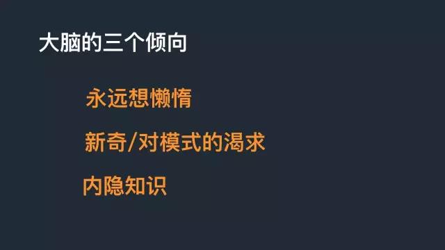 1)大脑永远想偷懒;2)大脑永远爱新奇,渴求模式;3)大多知识以内隐形式存在。