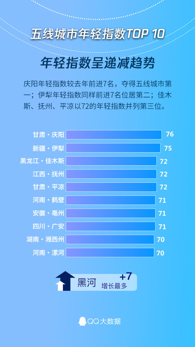 从《指数》来看,虽然五线城市的平均年轻指数与2017年持平,但TOP 10的城市年轻指数均有下降,这说明五线城市的年轻程度趋于平均。庆阳市以年轻指数76位居五线城市榜首,伊犁市以年轻指数75紧随其后,佳木斯市、抚州市、平凉市以72城市轻指数共同位列第三。黑河市年轻指数相较去年增长7个百分点,成为五线城市中增长最快的城市。