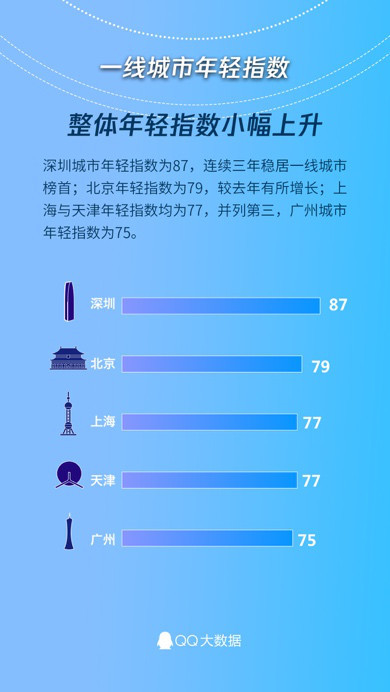 QQ大数据连续三年发布《全国城市年轻指数》报告,通过对QQ 7.83亿月活跃用户的城市分布情况进行分析,让更多人看到年轻人的发展偏好,用数据见证年轻一代为中国带来的改变。