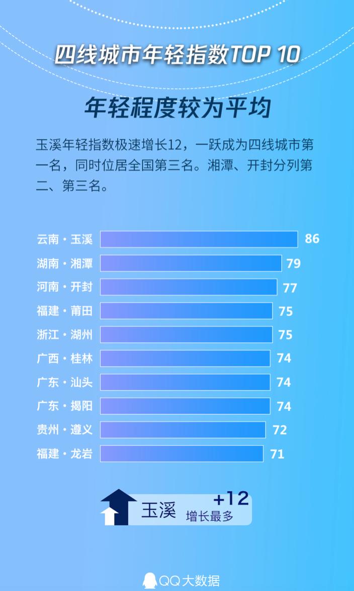 玉溪市以年轻指数86一跃成为四线城市之首,同时一路冲进全国城市年轻指数前三。湘潭市以指数79排名四线城市第二,开封市以指数77排名第三。随着新鲜事物向三四线城市的迅速扩散,一直在输出年轻人口的四线城市减缓了人口流失的速度,吸引了更多年轻人的目光。