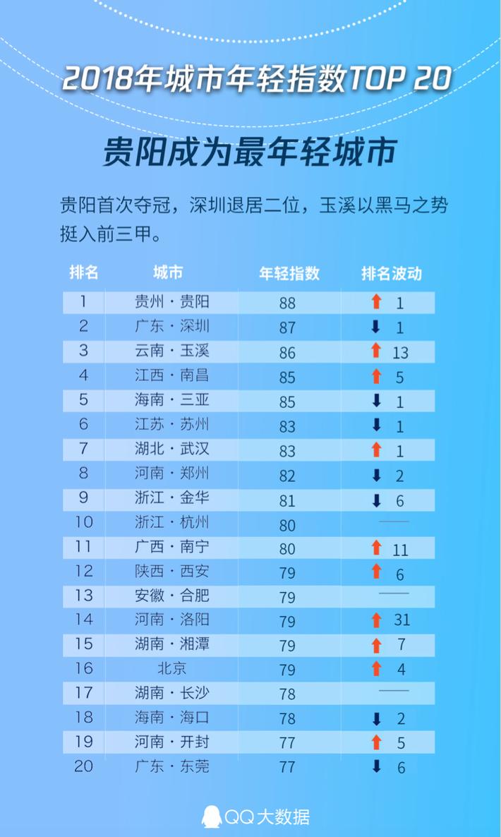 QQ大数据发布2018全国城市年轻指数:贵阳获“最年轻城市”